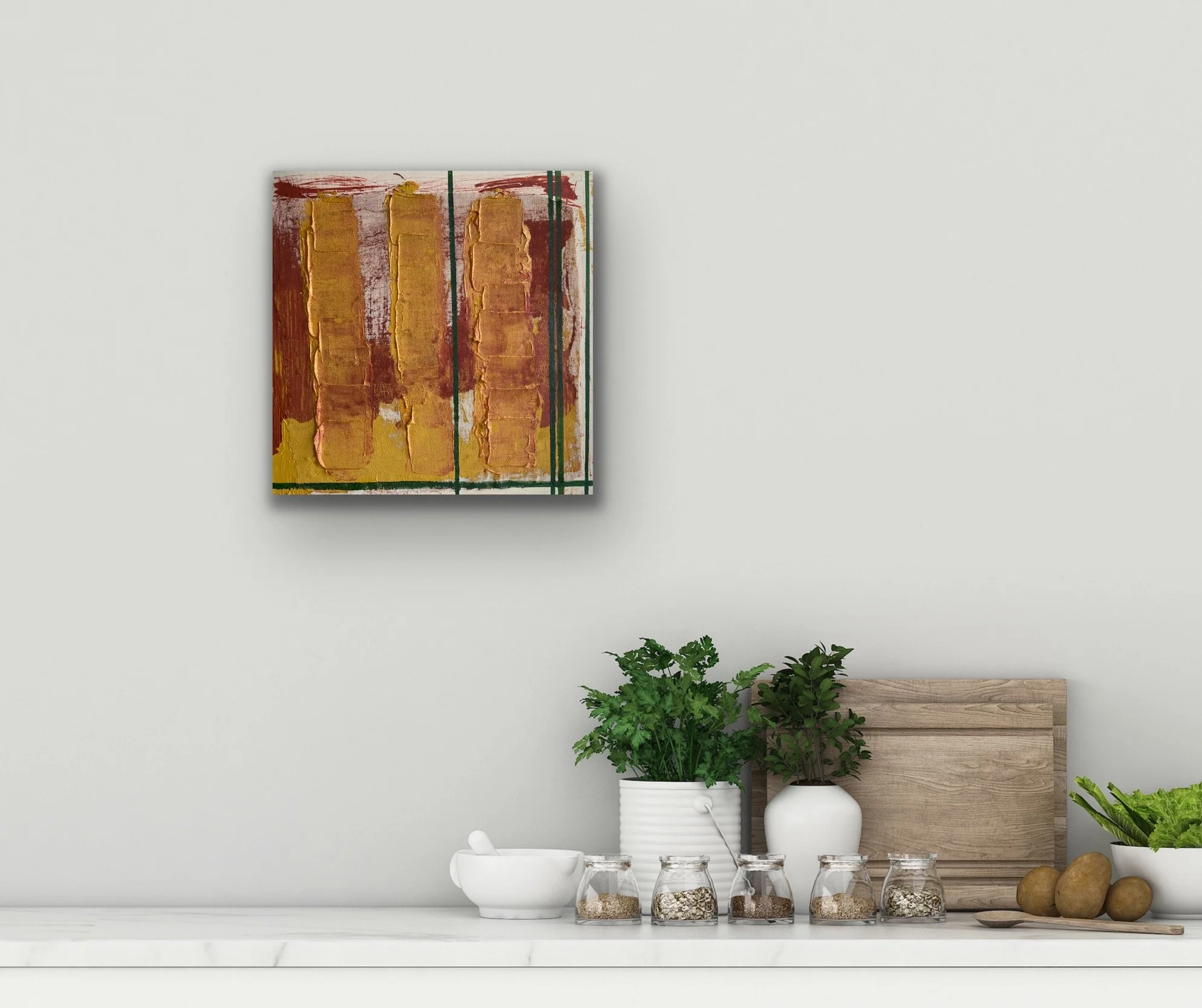16h X 16w x 1.5d (inches); acrylic, ink, linen on a birch wood panel (that can be easily placed on one or two nails)